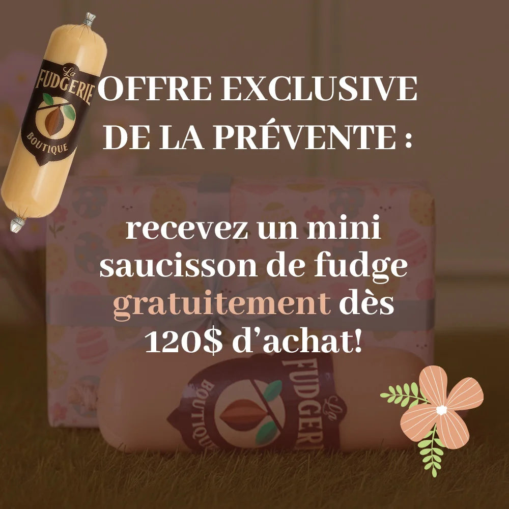 Ajoute ce saucisson de fudge à ton panier et, comme par magie, il deviendra gratuit dès que ton total atteindra 120$! ✨